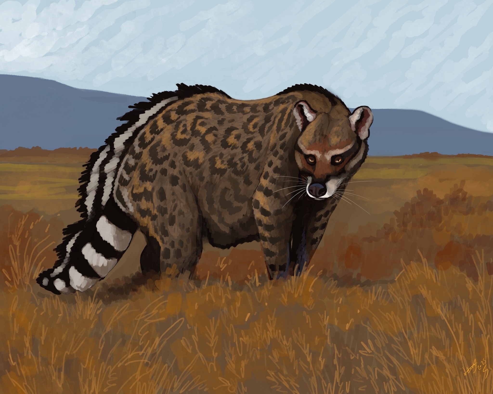 Civettictis vulpidens – гигантская «лисозубая» циветта из ЮАР, более крупная и менее специализированная по сравнению с современной африканской циветтой (Civettictis civetta). В начале плиоцена, 5,2 млн лет назад, этот среднеразмерный хищник из семейства виверровых сосуществовал на южноафриканских равнинах с другими мезохищниками – шакалоподобными псами Eucyon khoikhoi, а также с более крупными хищными – саблезубыми кошками, гиенами, медведями.