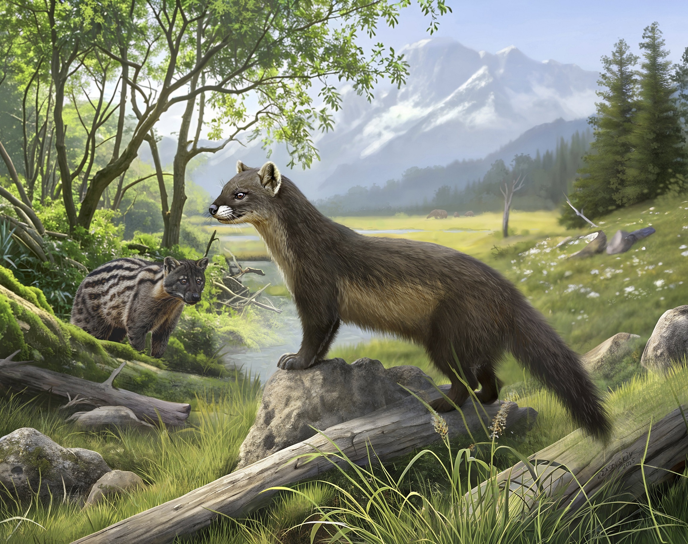 Circamustela bhapralensis – «как бы хорек» из деревни Бхапрал, представитель семейства куньих, живший примерно там же, где и предыдущий зверь (вон он приглядывается к соседу), около 4,5 млн лет назад (ранний плиоцен). Другие виды его рода обитали в Европе в более раннее время (в миоцене) и были покрупнее – этот индийский потомок европейских мигрантов уменьшился в Предгималаях, когда европейские сородичи уже вымерли.