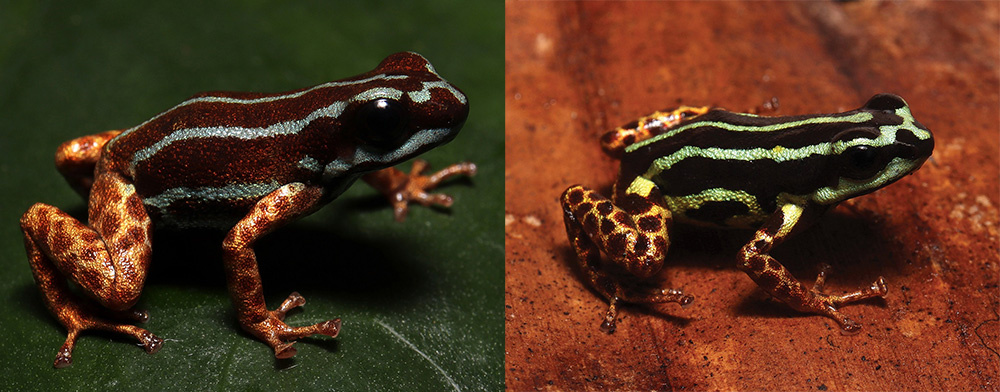 Ranitomeya aetherea («небесная») и R. aquamarina («аквамариновая») – еще два новых древолаза, родственных R. hwata, чьи имена описывают цвет полосок на их телах. Первый обитает в лесах у реки Журуа, второй – у ее притока Эйру на западе Бразилии.